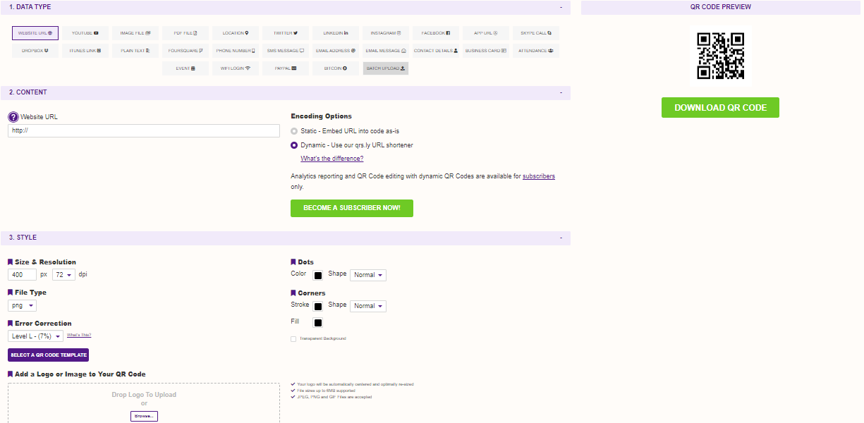 4: Choose the Style of code like Size, resolution, dots and corners color, add your logo and the type of file (Like Png, jpg, pdf, svg, tiff, dxf etc)