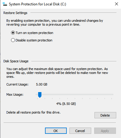 - Select “Turn On System Protection” and Click “OK“